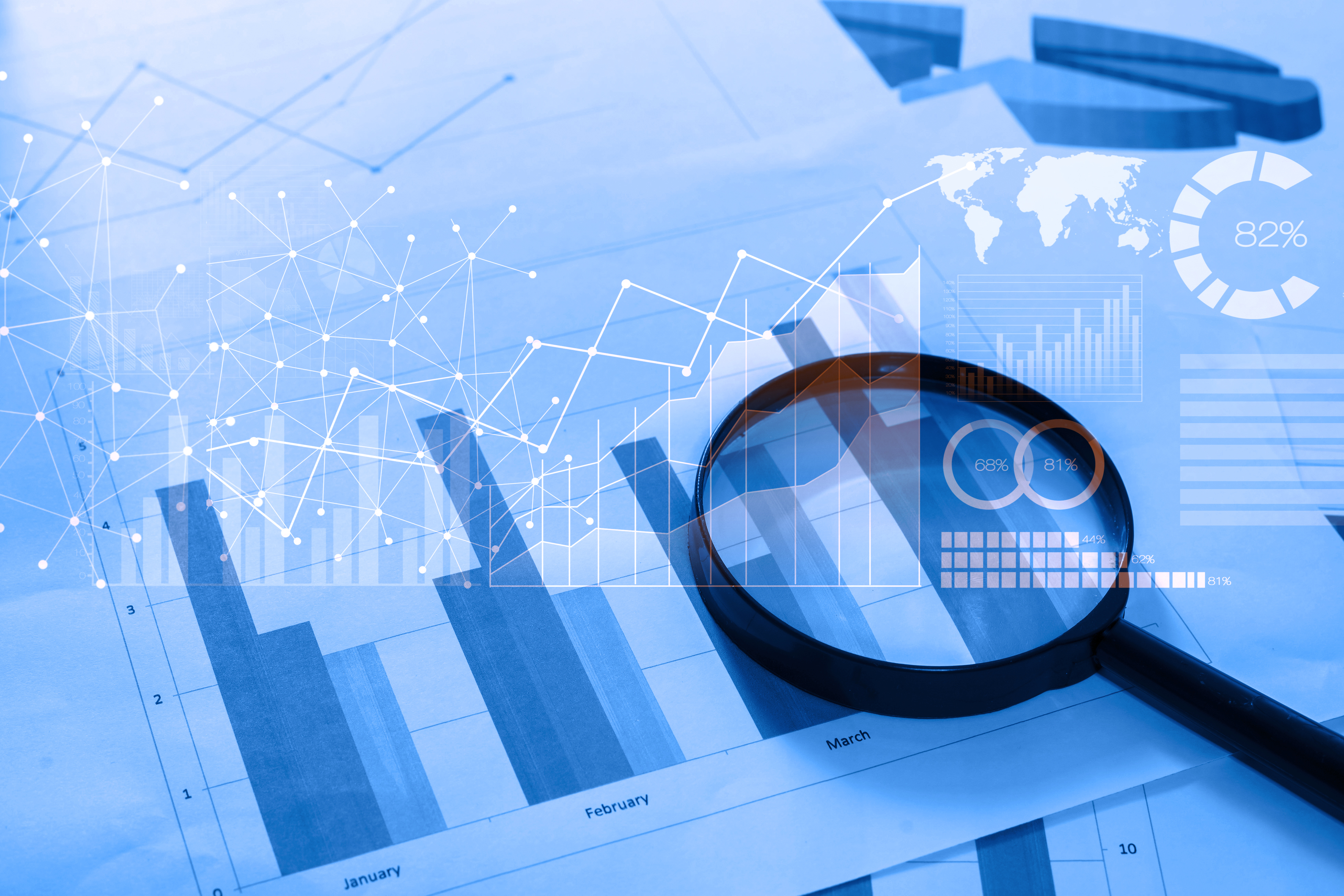 Magnifying glass and documents with analytics data lying on tabl